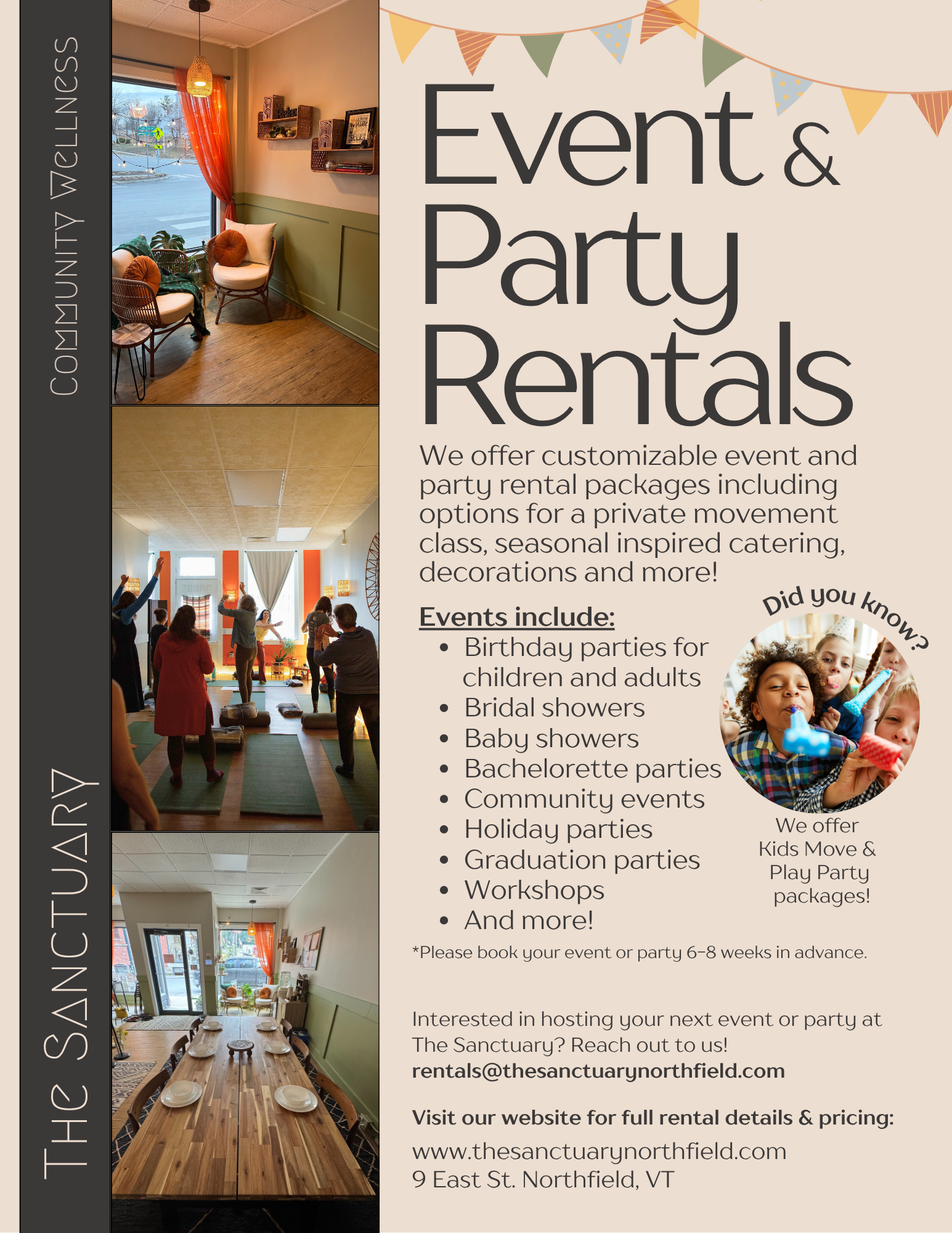 Check out our customizable party & event packages below. Stand alone private movement and yoga classes are also available. Questions? Ready to book? Contact us at rentals@thesanctuarynorthfield.com.